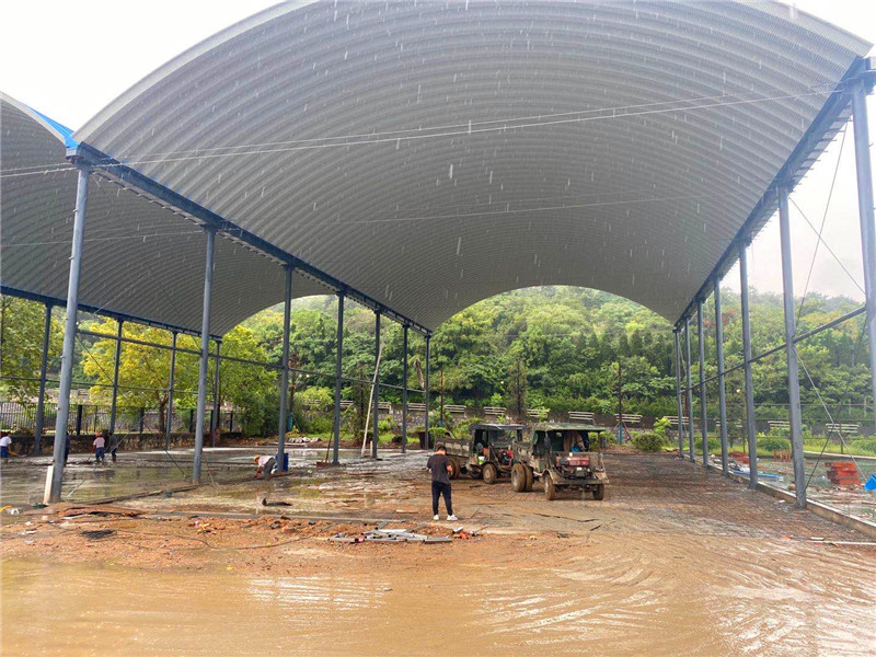 拱形屋頂采用兩連跨設(shè)計(jì),跨度達(dá)18米,高度約3.6米。盡管施工現(xiàn)場(chǎng)積水較深,但屋頂安裝完成后,施工人員依然能夠在屋頂下正常作業(yè),體現(xiàn)了設(shè)計(jì)的合理性與施工的專(zhuān)業(yè)性。
