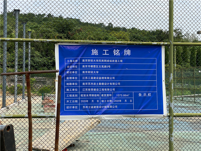 施工銘牌顯示,本次工程位于南京棲霞區(qū)的風(fēng)雨網(wǎng)球場(chǎng)改造項(xiàng)目,施工單位為江蘇杰達(dá)鋼結(jié)構(gòu)工程有限公司,確保施工質(zhì)量符合相關(guān)規(guī)范。